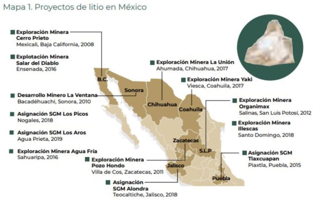 Datos del gubernamental Servicio Geológico Mexicano indican que hay al menos 57 yacimientos de litio y de los cuales 11 se consideran canteras viables para la explotación en el largo plazo. Las estimaciones potenciales hablan de unos 1.7 millones de toneladas alojadas en sedimentos arcillosos, cuya tecnología de separación es muy costosa.