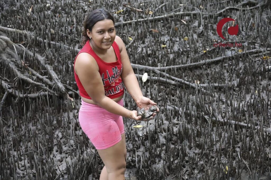 La hermana de Mileidy, Alva Gabriela Andino, de 24 años y madre de tres, también acompaña a su madre cada día en la búsqueda de curiles. Explica que cuando no logran recolectar suficiente molusco para vender, simplemente no hay dinero, y eso significa que no tienen con qué comprar la cena.