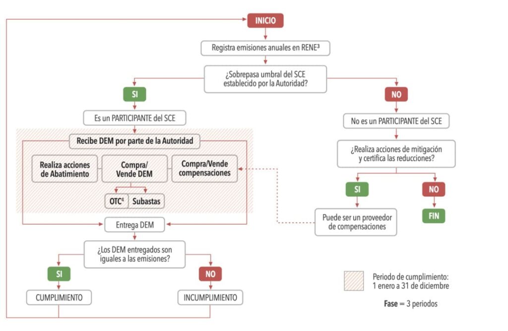 El SCE está basado en el modelo tope y comercio (cap-and-trade, en inglés), en el que existe una cantidad máxima de emisiones alineada con los objetivos de mitigación del país y que disminuirá con el tiempo hasta alcanzar la meta de reducción nacional.