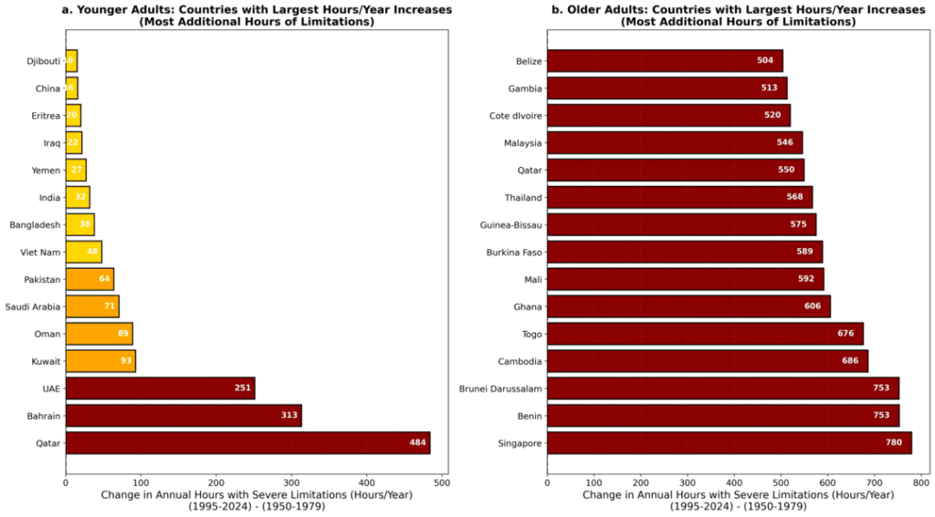Los impactos son más severos para las personas mayores. En promedio, las personas mayores de 65 años ahora experimentan alrededor de 900 horas al año —más de un mes de horas diurnas— en las que el calor limita gravemente la actividad segura al aire libre, en comparación con 600 horas en 1950. Para los adultos jóvenes, esa cifra aumentó de 25 a 50 horas en el mismo período. En algunas regiones tropicales y subtropicales, el calor restringe la actividad al aire libre de las personas mayores durante entre una cuarta parte y un tercio del año.