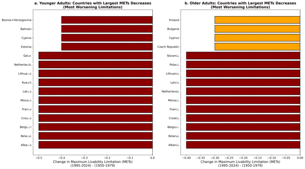 Al combinar más de 70 años de datos climáticos globales (1950–2024) con un modelo fisiológico de balance térmico que considera cómo responde el cuerpo a distintas condiciones según la edad, el estudio concluye que alrededor del 35 % de la población mundial vive actualmente en zonas donde el calor limita gravemente la actividad segura, incluso para adultos jóvenes durante las horas más calurosas del año.