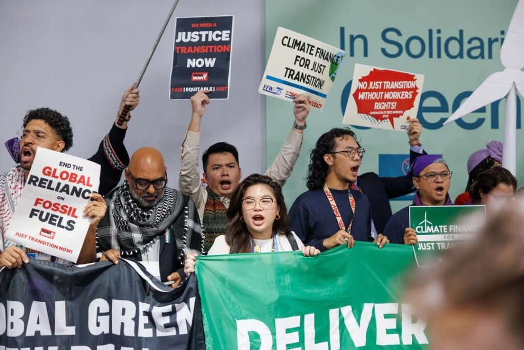 Manifestantes pedem transição justa durante COP29, realizada em 2024 em Baku, no Azerbaijão. Crédito: UN Climate Change - Kamran Guliyev