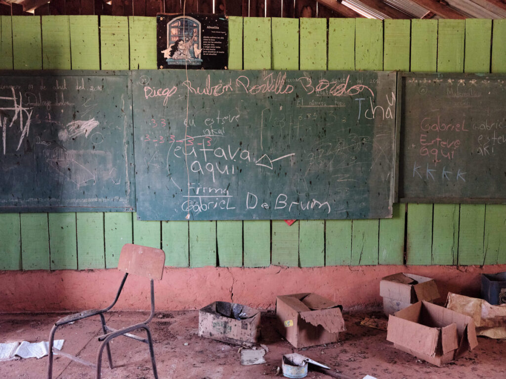 Hoy la escuela parece devorada por la ampliación de las plantaciones sojeras, que se pueden ver a través de las ventanas rotas de las dos construcciones donde un profesor daba clases a tres cursos a la vez. Dentro de las aulas, cuadernos de ciencias naturales y ética están abandonados en pupitres. En medio de una de las salas, un mapa de Paraguay yace en el suelo. Cuando entramos con el fotógrafo, un puntazo visual rompió mi talante de reportero.