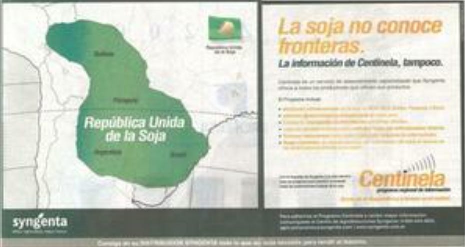 Así se construyó la República Unida de la Soja, como la denominó Syngenta en un anuncio publicitario de 2003, en alusión al espacio entre Argentina, Brasil, Paraguay, Uruguay y Bolivia donde la leguminosa desplazó bosques, pastizales y poblaciones como la de Yerutí, utilizando semillas modificadas genéticamente para soportar el uso de plaguicidas, pesticidas y herbicidas como el RoundUp.